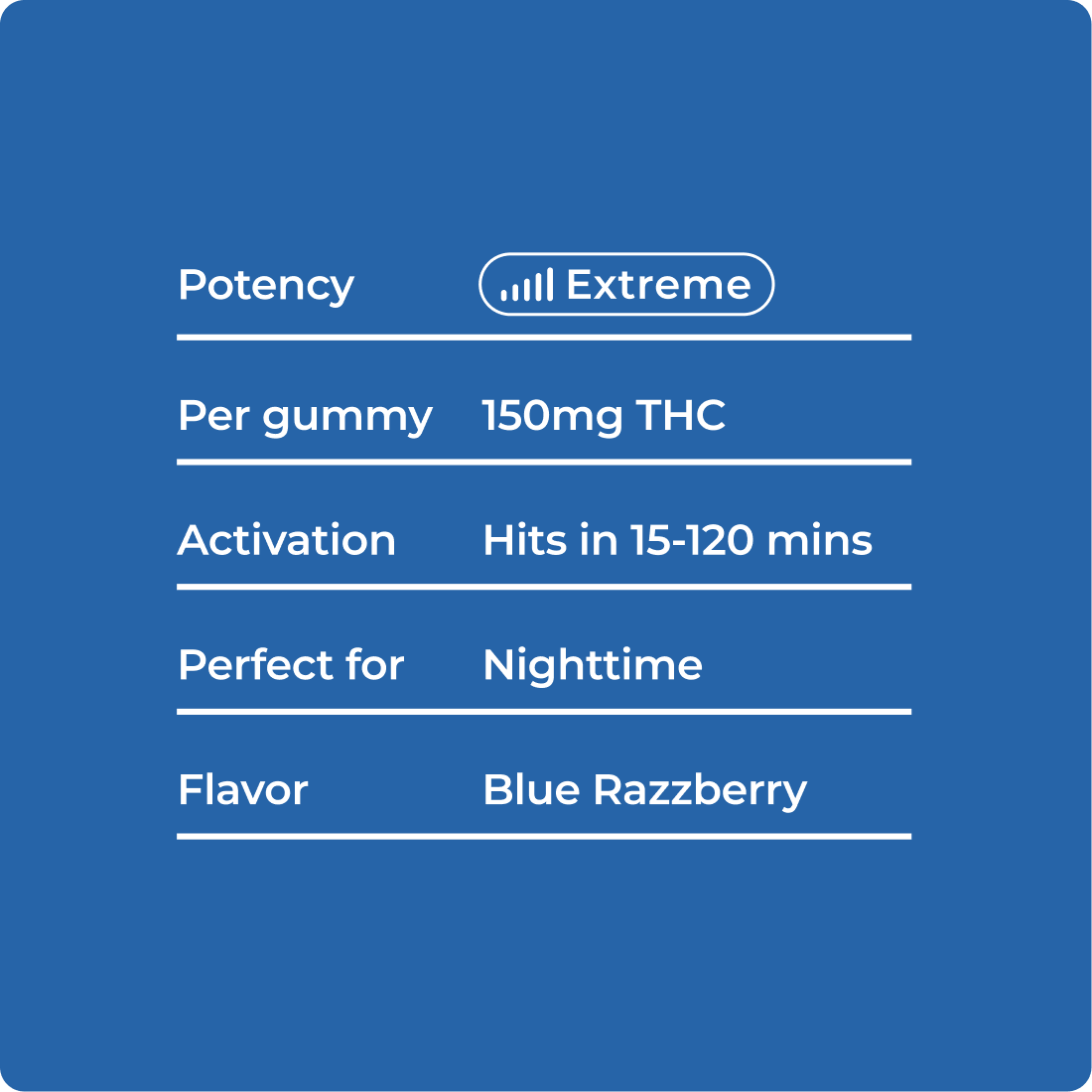 Candy-coated rope bursting with bombastic Blue Razz flavors, delivering smooth, full body relaxation and nostalgic joy.