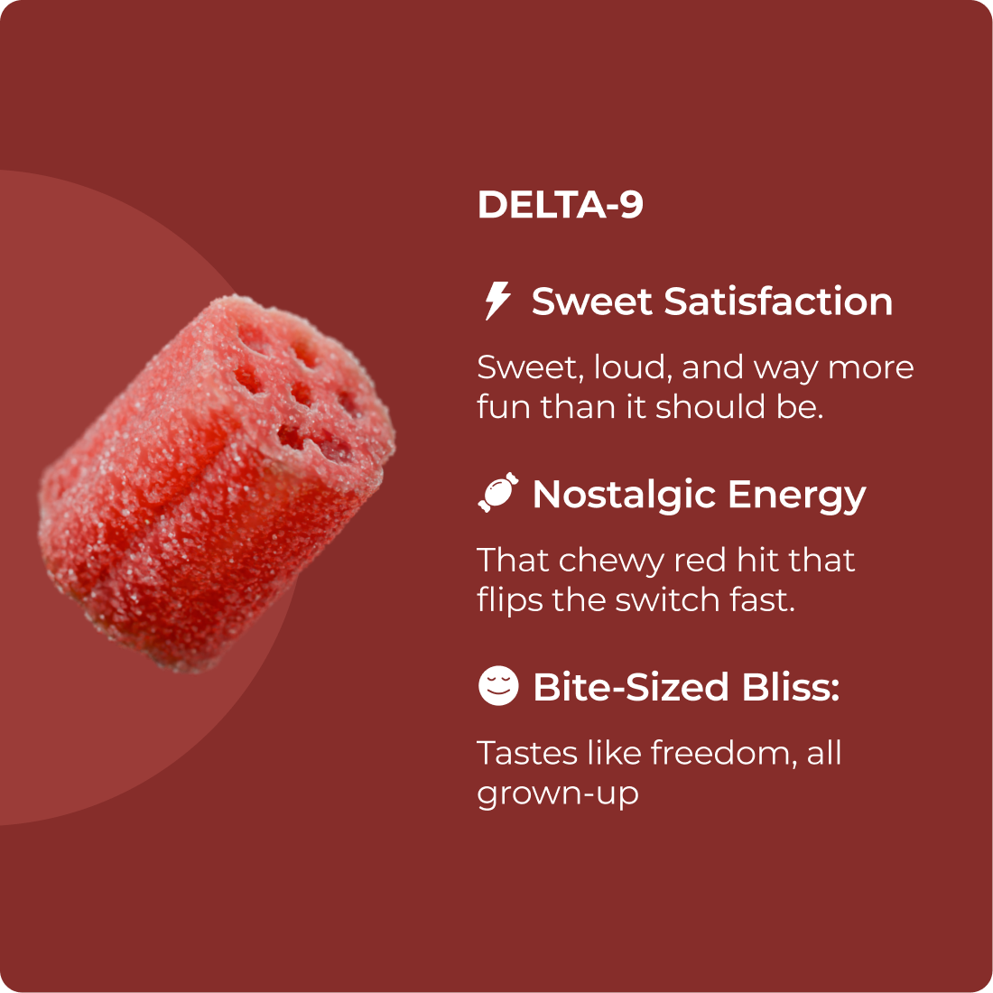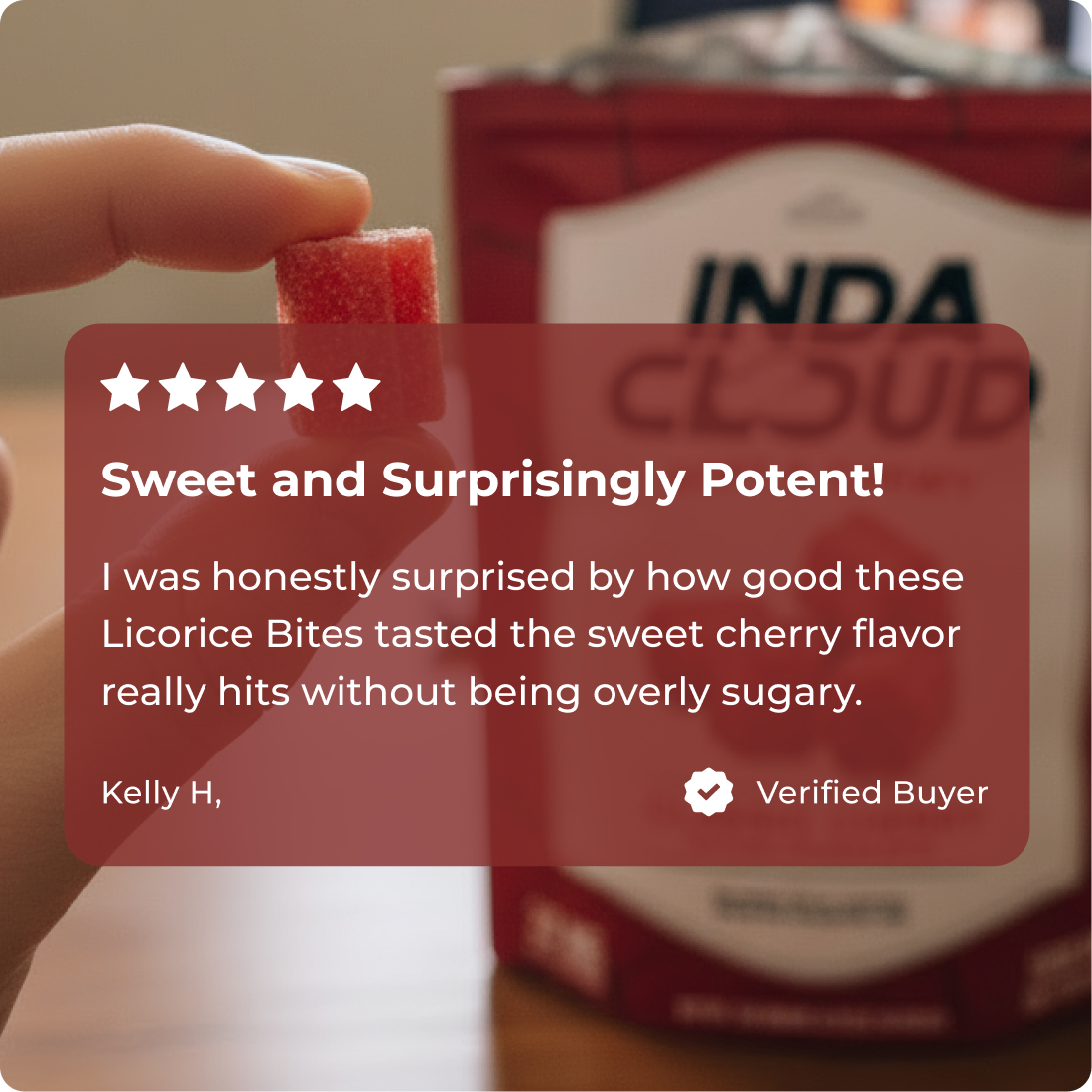 Bold cherry meets classic licorice in bite size form. Potent, chewy, and nostalgic with a full-body buzz that lasts.