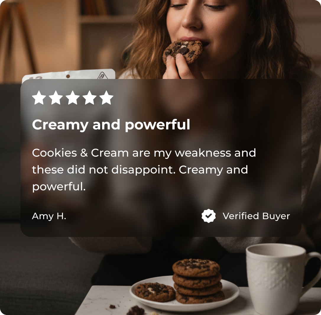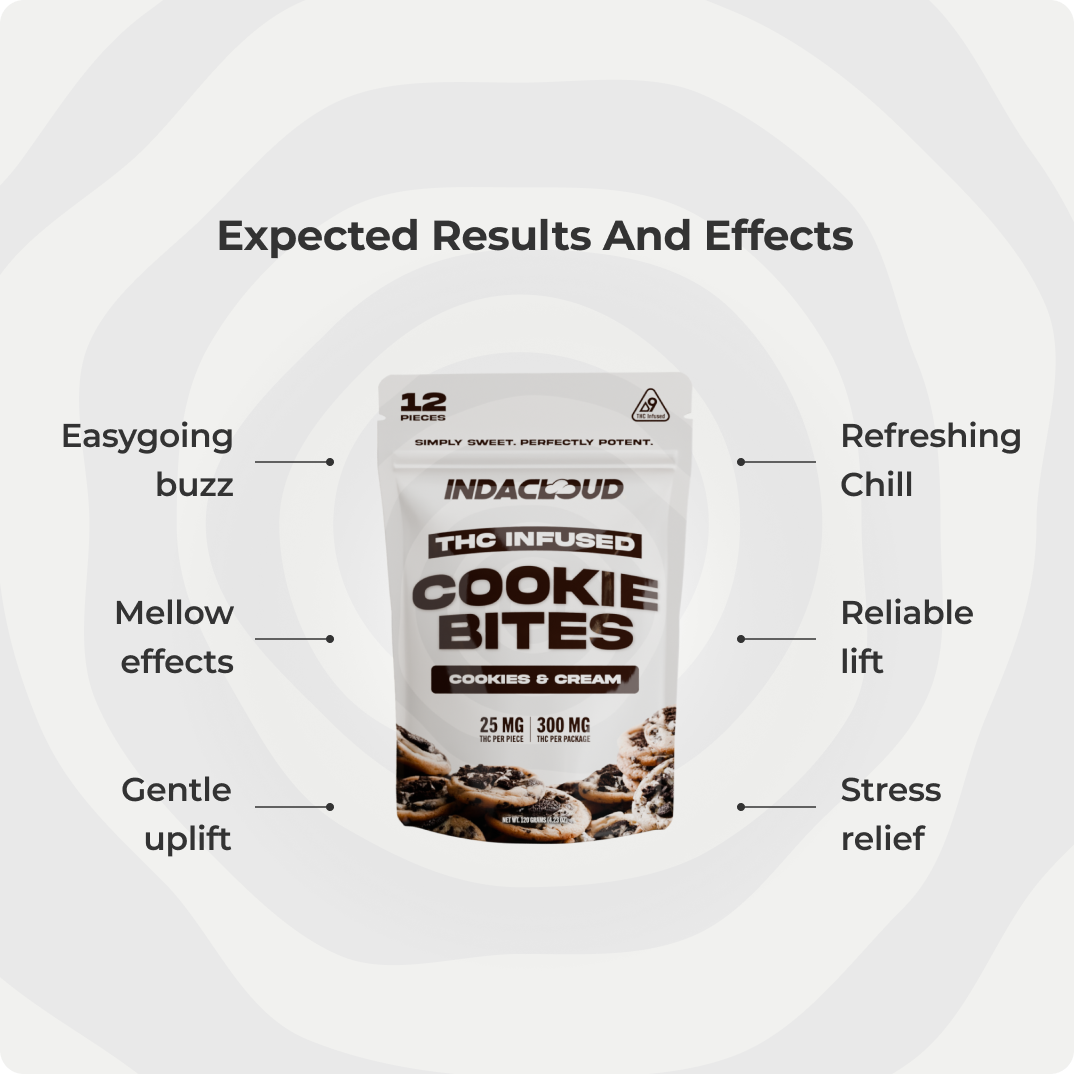 Crisp cookies & cream bites with an infused twist, a decadent delight that layers deep cocoa, velvety vanilla, and mellow effects in every precisely crafted piece.