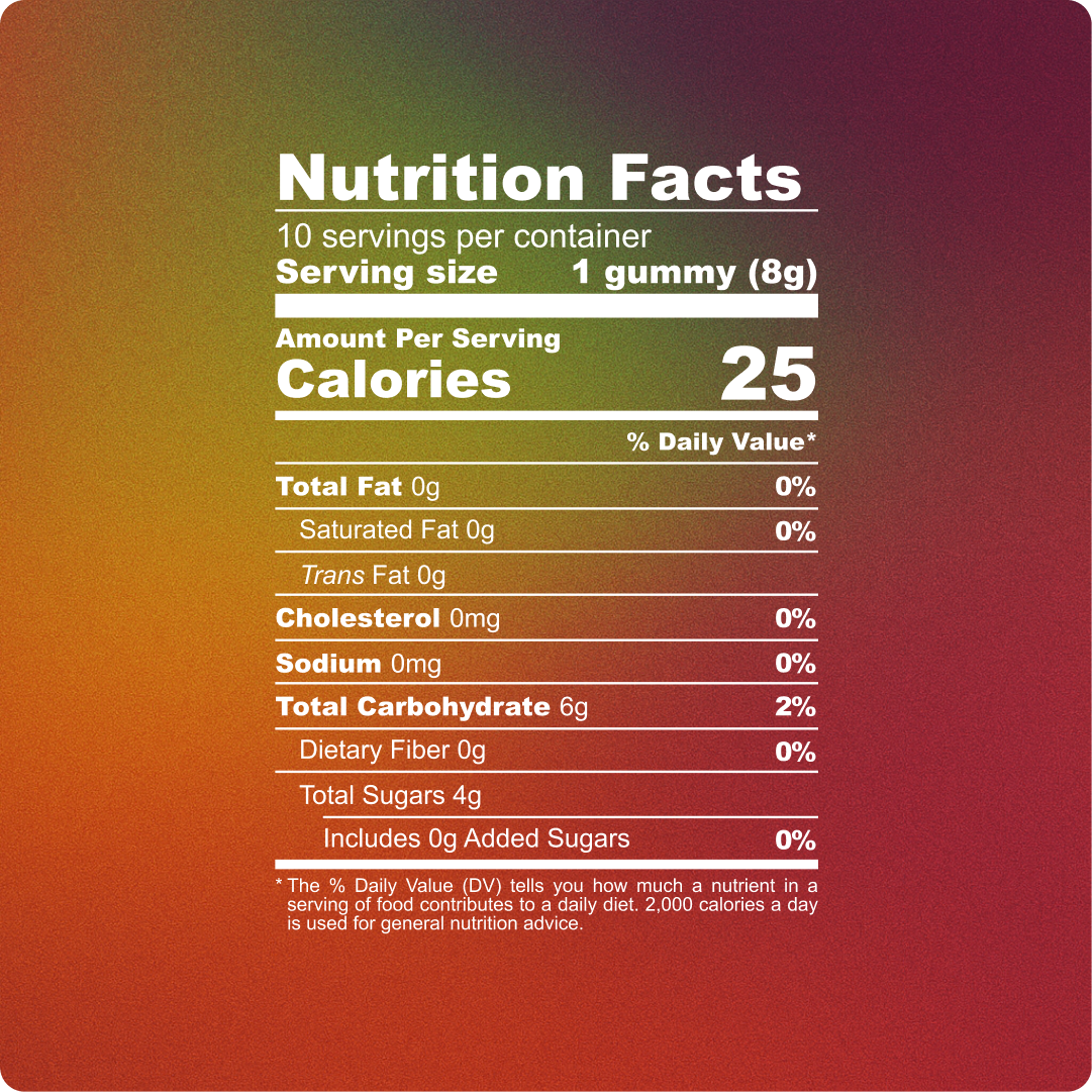 Corn syrup, cane sugar, fruit pectin, potassium citrate, organic natural flavoring (organic natural flavors, organic gum acacia) and color, citric acid, delta-9 concentrate