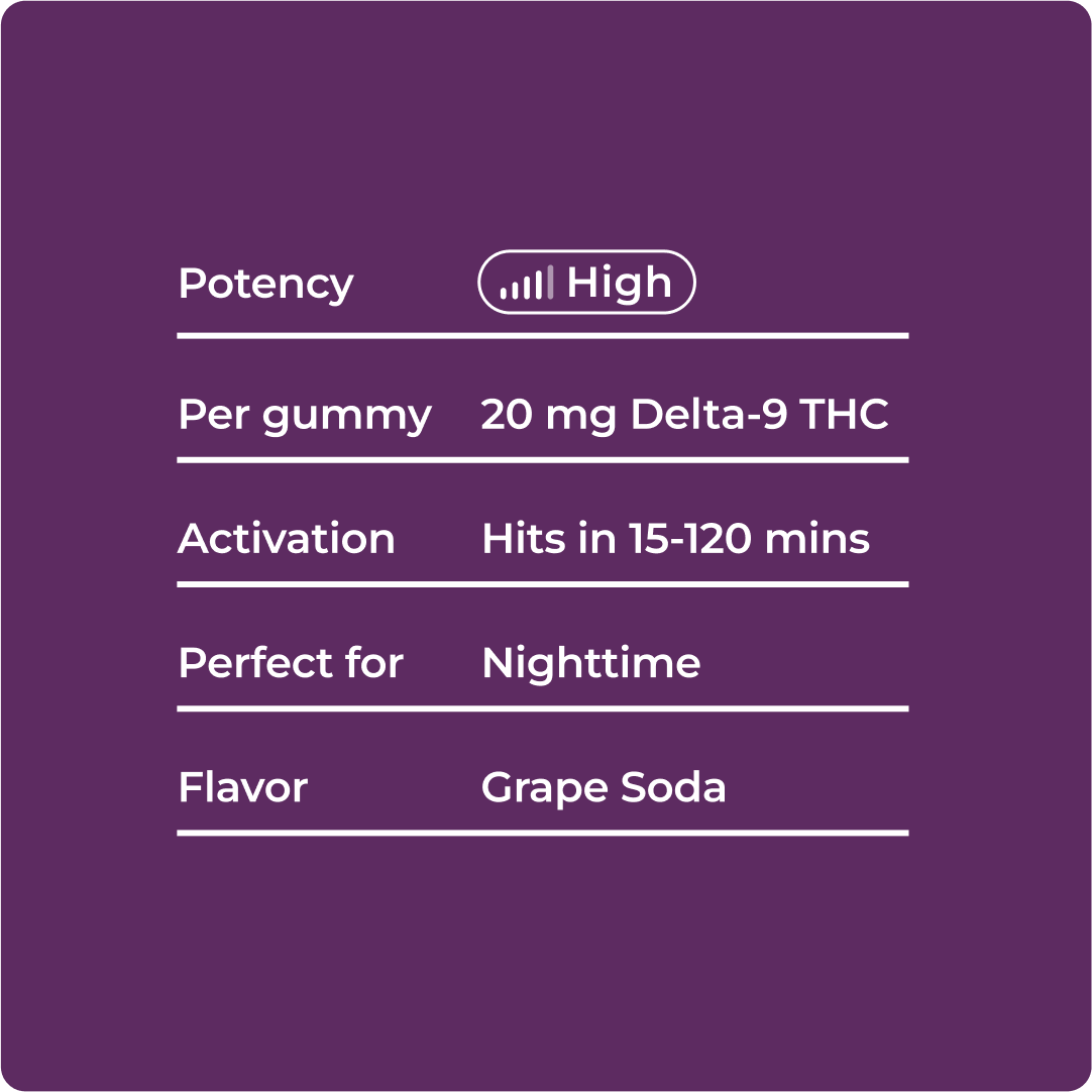 Each Grape Soda Shop Gummy boasts a robust 20mg of Delta 9 THC, a dose designed to deliver a powerful effect for seasoned users and offer a manageable starting point for newcomers. Always start slowly and adjust your dosage based on your personal tolerance and desired experience to ensure safe and enjoyable consumption.
