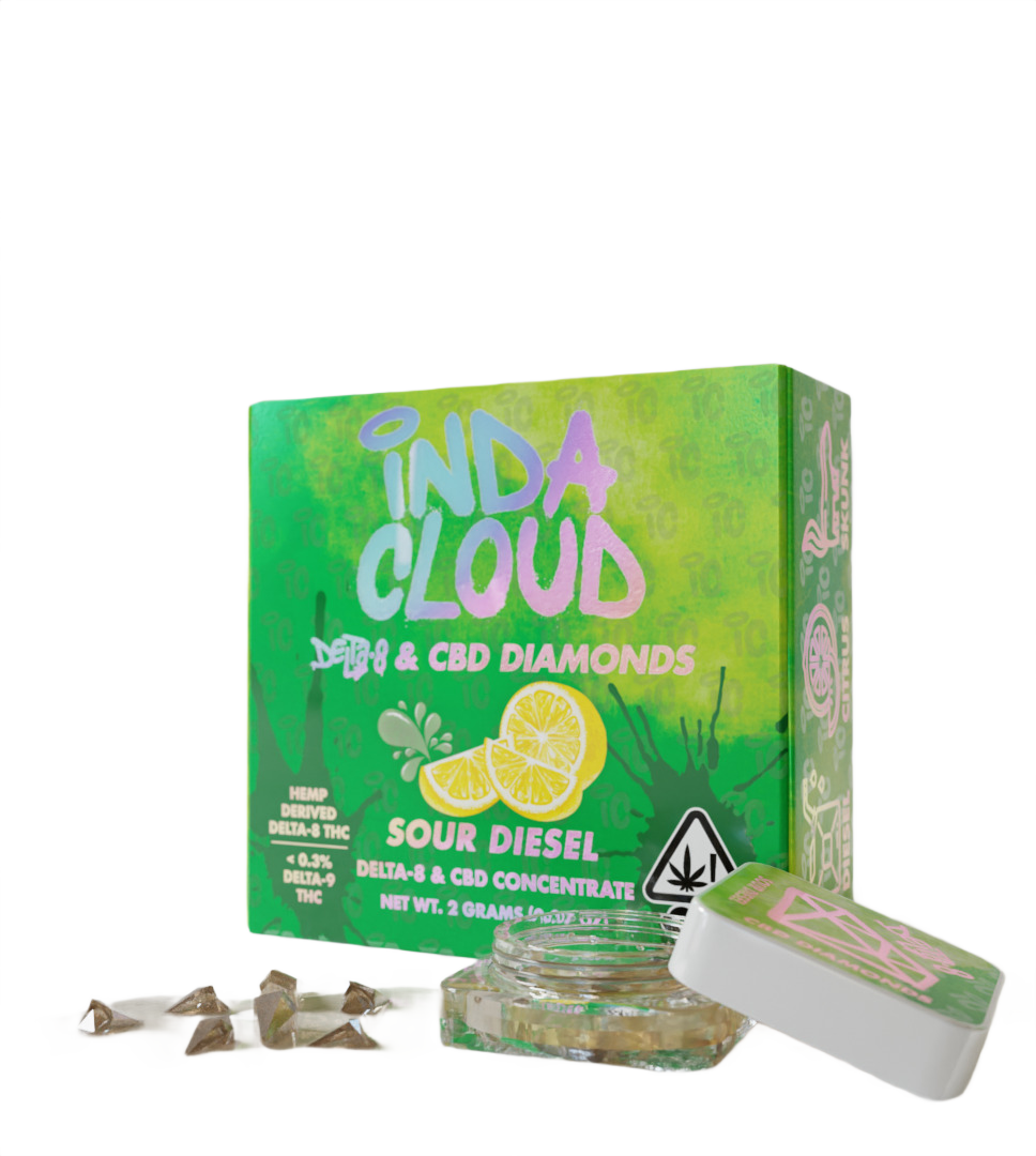 Sour Diesel Delta 8 Diamonds is a unique and premium CBD product Indacloud HQ offers. It is a blend of CBD and Delta 8 concentrate, referred to as "diamonds," suspended in a terpene-rich solution known as "sauce." Unlike regular CBD products, which primarily contain CBD isolate, or broad-spectrum CBD, Sour Diesel Diamonds & Sauce combines the benefits of CBD and Delta 8, offering a more potent and versatile experience. The CBD is extracted and isolated from intoxicating elements, ensuring it retains the non-psychoactive properties, while the Delta 8 provides a mild psychoactive effect. This combination allows users to experience the therapeutic effects of CBD alongside the subtle euphoria and relaxation induced by Delta 8, creating a well-rounded and enjoyable experience for consumers.
